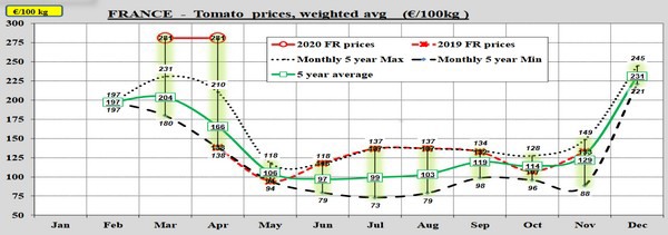 Vooral Frankrijk, nochtans een land met een beperkte eigen teelt, valt op met in maart en april (t/m 16 april) prijzen die met 2,81 richting de 3 euro per kilo gaan. Trostomaten gingen zelfs voor prijzen boven de 3 euro per kilo over de toonbank voor de Pasen, reden voor o.a. Nederlandse handelaren om in te stappen.