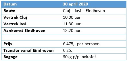 Global Aviation is al 26 jaar dé verhuurder van vliegtuigen en regelt het gehele vervoer t/m eindbestemming en beschikt, over verschillende toestellen van privéjets tot Boeing en Airbus (www.globalaviation.nl). Ze zijn structureel (24/7) ingesteld op flexibiliteit en aangepaste vluchtplannen, dus ook van en naar kleinere vliegvelden. Geïnteresseerden kunnen zich aanmelden voor de vlucht op 30 april door te mailen naar [email protected].