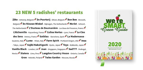 Er zijn in totaal 25 nieuwe restaurants opgenomen in de We're Smart Green Guide 5 Radish' lijst 2020 waaronder twee Nederlandse: Restaurant Hotel Merlet en Restaurant De Nieuwe Winkel van Dutch Cuisine ambassadeur Emile van der Staak.