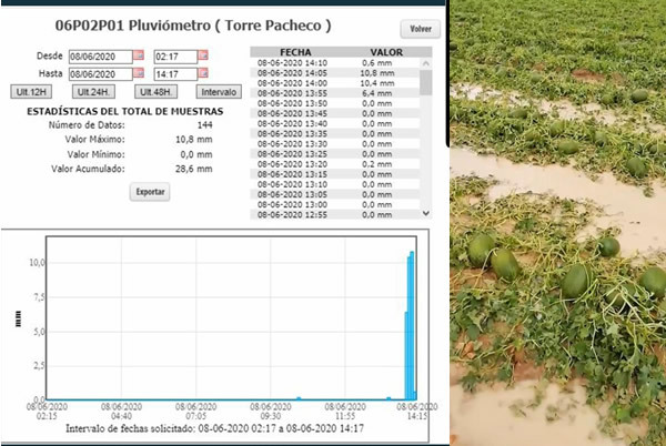 De telers- en exporteursvereniging Proexport heeft enkele video's gepost op social media van percelen met meloenen in Roldán, een gehucht behorend tot de gemeente Torre Pacheco. De velden staan blank en microtunnels zijn volledig vernietigd door de hagel, enkele dagen voor de oogst.