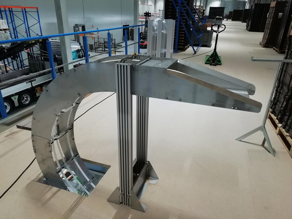Nabij elke machinelijn (10 stuks) is een gecompliceerde RVS glijgoot constructie geïnstalleerd waarmee nieuwe dozen vanaf de zolderverdieping naar de werkplekken worden gebracht.