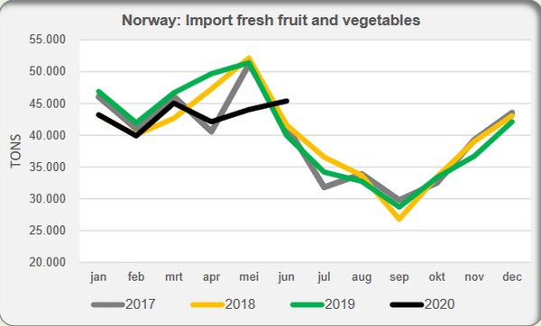 Noorwegen heeft in de eerste helft van dit jaar 6% minder verse groenten en fruit ingevoerd dan in de eerste helft van 2019. Vergeleken met de eerste helft van 2018 was het 3% minder. Vooral in april en mei bleef de import achter. In januari, februari en maart was de min kleiner. In juni werd er daarentegen behoorlijk meer ingevoerd dan in voorgaande jaren.