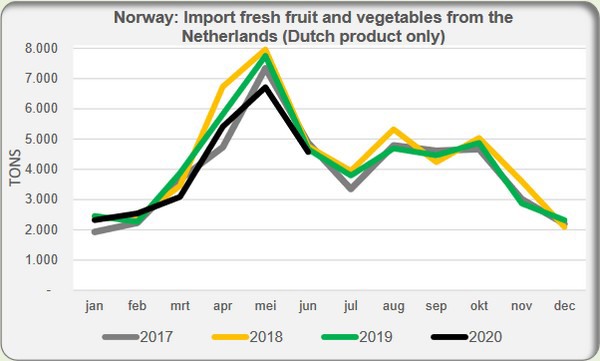 In de eerste helft van dit jaar werd er in Noorwegen 24.650 ton in Nederland geteelde verse groenten en fruit ingevoerd. Dat was ca. 10% minder dan in de eerste helft van 2018 en 2019. Die daling kwam vooral omdat er veel minder Nederlandse peren, aardbeien en uien werd ingevoerd. De import van paprika’s bleef op peil en van er werden meer Nederlandse tomaten ingevoerd.Kleinere Nederlandse producten die een plus lieten zien waren: kroten, peen aubergines en bloemkool/broccoli. Minder belangrijke Nederlandse producten die het in Noorwegen in de eerste helft van dit jaar niet goed deden waren: komkommers en kool.
