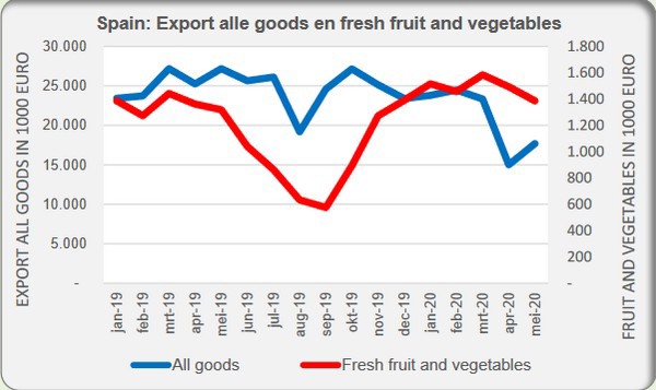 Dit alles op basis van de geëxporteerde hoeveelheden. Naar waarde gezien was het beeld anders. Zelfs in mei was de waarde van de Spaanse export van verse groenten en fruit met 1,3 miljard euro vrijwel even groot als vorig jaar in mei terwijl in de eerste vier maanden de waarde van de export van verse groenten en fruit groter was dan vorig jaar. Opvallend is de scherpe terugval van de totale Spaanse goederenuitvoer sinds het uitbreken van de coronacrisis. In januari en februari was de Spaanse goederen export dit jaar vrijwel even groot als vorig jaar maar in maart was het 14% minder en in april en mei was het met respectievelijk 41% en 35% veel minder dan vorig jaar. Absoluut gezien daalde de totale Spaanse export in beide maanden met 10 miljard euro. In april en mei was het aandeel van verse groenten en fruit in het totaal bijna 10%, tegen 5% in 2019.