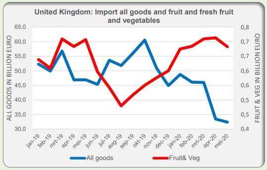 Naar waarde gezien was de Britse import van verse groenten en fruit in alle vijf de eerste maanden van dit jaar echter vrijwel gelijk aan vorig jaar. De totale Britse goederenexport was in euro’s uitgedrukt voor de crisis al kleiner dan vorig jaar, maar in april en mei duikelde de goederenimport met bijna een derde ten opzichte van dezelfde maanden in 2019.
