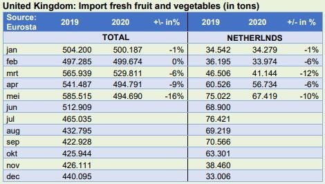 Over de maanden maart t/m mei was de Britse import van verse groenten en fruit 10% kleiner dan vorig jaar. De import vanuit EU-landen bleef iets verder achter dan die uit andere landen. Dit geldt niet