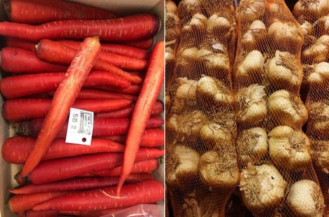 Links: rode wortelen van de nieuwe oogst uit Frankrijk