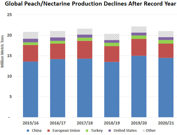 De wereldproductie van perzik en nectarine zal naar verwachting met 1,1 miljoen ton dalen tot 21,0 miljoen ton, omdat de ongunstige weersomstandigheden de productie van de grootste producenten, China en de Europese Unie, beïnvloeden. Verwacht wordt dat de wereldhandel zal krimpen als gevolg van de verminderde mondiale bevoorrading.