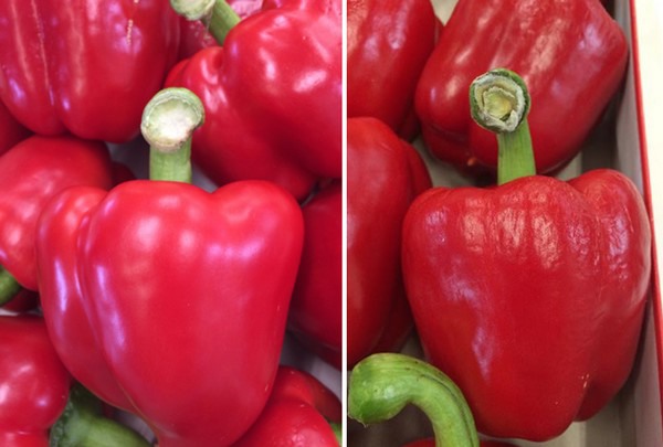Testresultaat van paprika’s via de verpakkingstechniek van PerfoTec & Oerlemans (links) en via de traditionele manier van verpakken na 25 dagen bij een temperatuur van 5C.