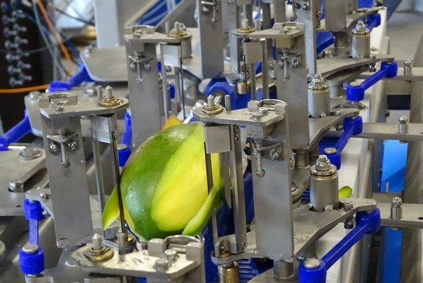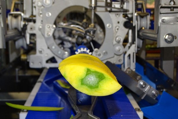 ‘We zijn verheugd dat hij nu bij ons in de werkplaats staat te draaien. Aan het design is best wat veranderd. Zo zijn er minder afschermingskappen waardoor de machine eenvoudiger te reinigen en onderhouden is en ook de footprint is wat kleiner geworden. Maar de unieke schilmethode, van kop naar kont, en het transporteren van de vrucht op de pit is hetzelfde gebleven. Ook de yield resultaten zijn bij de kleine versie heel mooi. Er is weinig vruchtverlies doordat de machine schilt met dunschillers die de outline van de vrucht volgen. Ook het ontpitten met de komvormige oscillerende messen zorgt ervoor dat de vrucht niet beschadigt en er dicht op de pit gewerkt kan worden’.