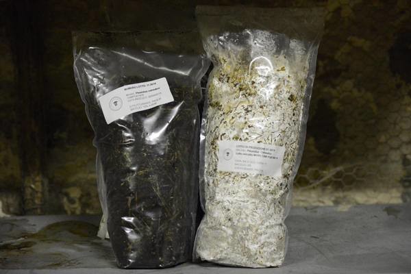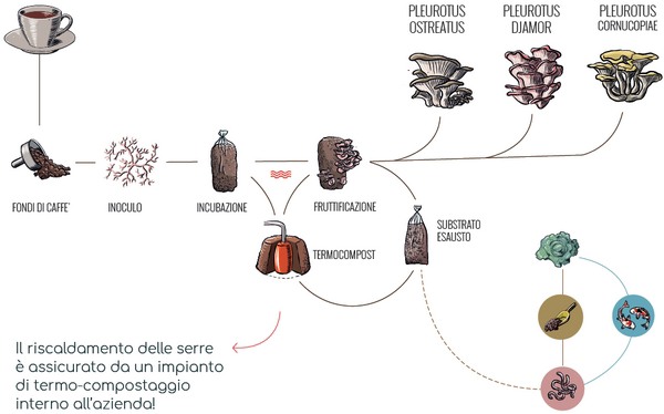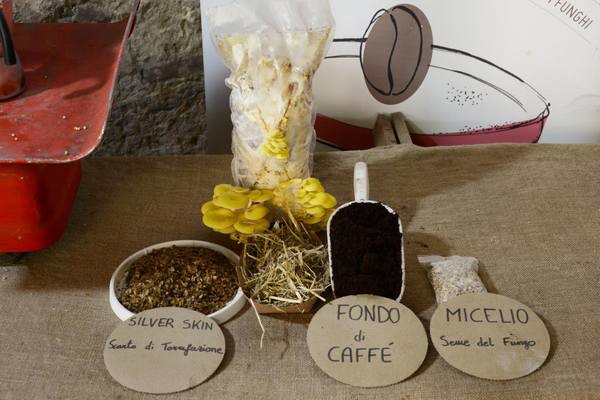 “Om de substraat te creëren maken we gebruik van geïmporteerde groene koffiebonen die worden geroosterd in onze branders. Bij dit proces ontstaat een afvalstof die we zilverhuid noemen. Ook ontvangen we dagelijks 60 kilo koffiedik van diverse bars in de regio. Met de toevoeging van de zogeheten zilverhuid krijgen de paddenstoelen de juiste hoeveelheid lucht waardoor ze goed kunnen ademen. Het mycelium, het zaadje, wordt gemengd met de koffiedik en de zilverhuid, waardoor er een ideale substraat ontstaat”, zegt Di Giovanni.