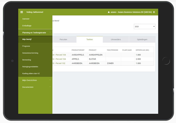 “Ook voeren telers hier informatie in van hun bedrijf. Zo krijgt Veiling Zaltbommel inzicht in de arealen, percelen en teelten die de teler voor een bepaald seizoen gaat leveren. De teler wordt gevraagd om prognoses te maken per jaar, week en dag van de producten die hij verwacht te leveren. Hierdoor kan de Veiling beter vraag en aanbod op elkaar afstemmen.” Rens vult aan: “En deze informatie kunnen wij weer terug ontsluiten richting de leden, in het belang van een transparante datastroom, een van de speerpunten in onze nieuwe strategie.”