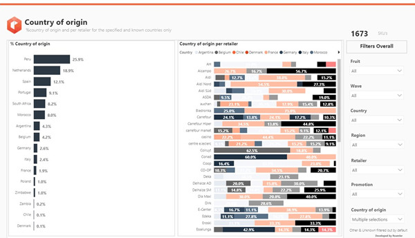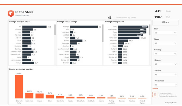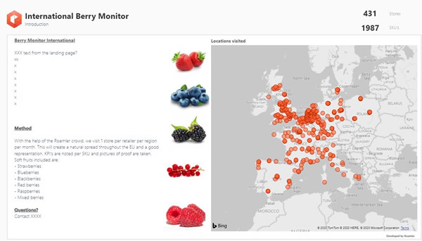 "Wij bieden de deelnemers gedetailleerde rapportages over eenheid, prijs en promotie, inclusief foto's van prijskaartjes en landen van herkomst van elk product. De monitor geeft goed inzicht in de overgang van seizoenen door het volgen van leverancier en land van herkomst. Door dit weer te geven in Power BI, is deze data realtime inzichtelijk en toegankelijk in het dashboard. Alle foto's zijn makkelijk te bekijken en te downloaden vanuit de online omgeving", vertelt Rijnhout. De Berry Monitor gaat vanaf 1 januari 2021 officieel van start, maar dan zijn de eerste twee rondgangen bij de Europese retail al geweest en is de eerste data vergaard bij 600 locaties van Europese supermarkten, inclusief Aldi, Lidl, Tesco, Carrefour en E-Leclerc.