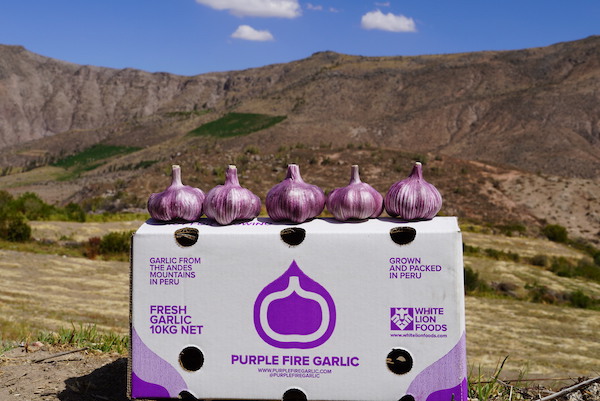 Een van de knoflookvariëteiten die White Lion Foods teelt is de Purple Fire variëteit. Dit is een relatief nieuw ras dat zijn heldere paarse kleur krijgt door op grote hoogte in de Peruaanse hooglanden te worden geteeld. "We hebben grond gevonden voor nieuwe velden met deze variëteit, dus dit jaar planten we er meer van. We zijn erg trots op deze knoflook en werken eraan om onze markten voor deze knoflook uit te breiden," zegt Machuca.