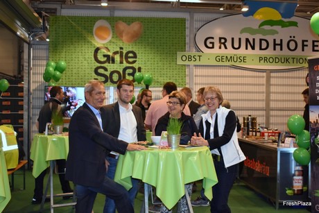Van links naar rechts: Peter, Thomas en Inge Grundhöfer, met FreshPlaza-directeur Silke Pfeffer op de Grundhöfer-stand (foto: juni 2019 FreshPlaza)