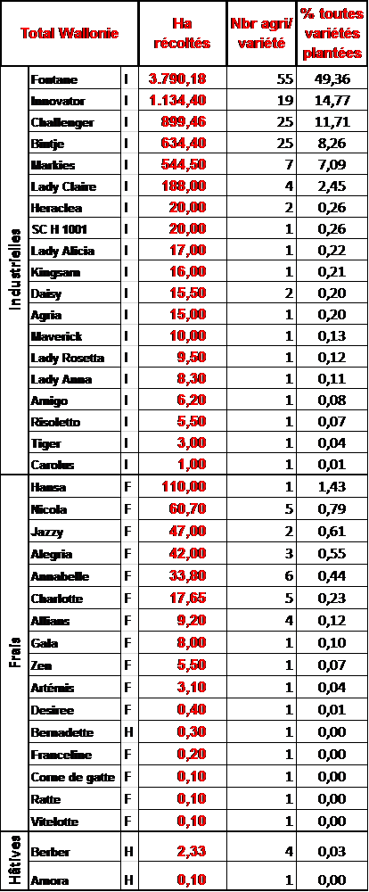 Andere rassen (Markies, Lady Anna, fritesrassen en versmarktrassen): op 15 november is hun voorraad geraamd op 540.000 ton, 72% van de initiële opbrengst. De partijen die sinds de start van de oogst zijn afgezet worden geschat op 210.000 ton, voornamelijk op contractbasis (170.000 ton). De huidige voorraden zijn voor 80% gecontracteerd. Dit betekent dat slechts 110.000 ton buiten een contract om wordt geleverd. Voor deze rassen stabiliseerde de grootte van de oppervlakken zich de laatste jaren. Deze bedraagt zo'n 17.000 ha.