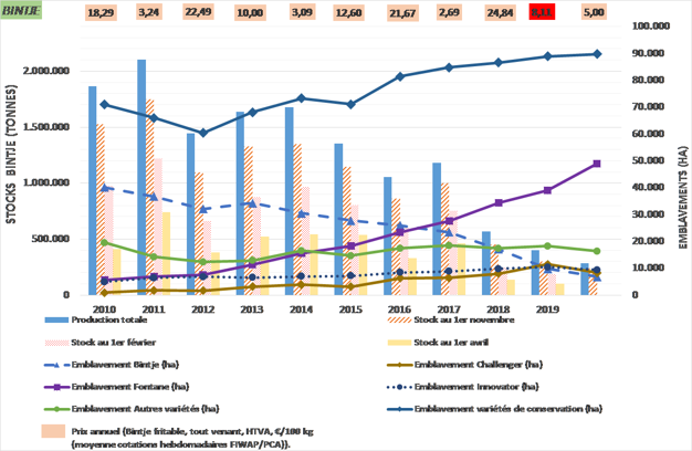 Sinds het begin van het seizoen zijn de markten naar verluidt slechts 40.000 ton Bintje (15% van de oorspronkelijke opbrengst) kwijtgeraakt. Vorig jaar was dat nog 100.000 ton, in 2017 nog 190.000 ton en in 2014 was dat 330.000 ton... De Bintje-markt is een nichemarkt, waarin gespecialiseerde gebruikers (met name die de aardappel gebruiken om te verwerken tot verse frites, of om er schijfjes van de maken) moeten steeds vaker contracten sluiten met telers en strijden om de kleine partijen die buiten een contract om geleverd kunnen worden.