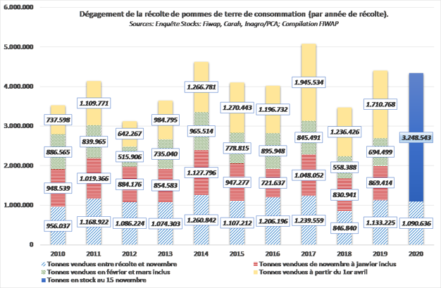Op basis van de resultaten van het voorraadonderzoek dat op 15 november 2020 door Fiwap, Carah, PCA en Inagro een is gedaan onder 208 Belgische aardappeltelers, bedraagt de bruto nationale opbrengst van consumptieaardappelen (alle rassen) 4,34 miljoen ton.
