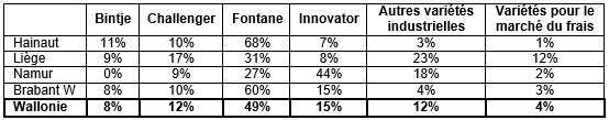 Tabel 1: Overzicht van het aantal aardappelen per ras (percentage) dat is geteeld door de telers die in 2020 in Wallonië zijn ondervraagd: