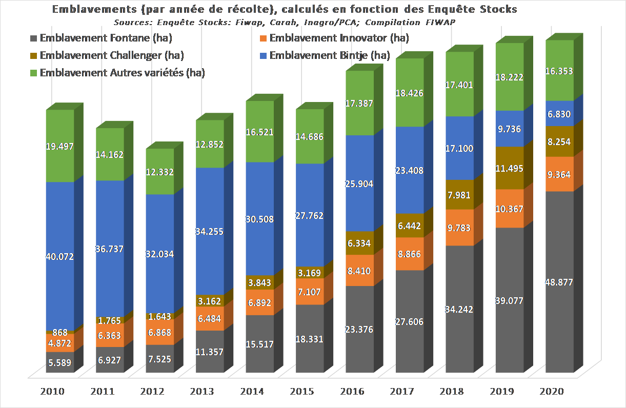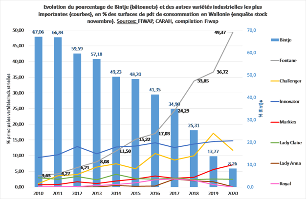 Binnen de Belgische aardappelopbrengst is Fontane zeer dominant geworden met alleen 2,22 mln ton (of meer dan 50%!), terwijl Bintje slechts 6% van de nationale opbrengst vertegenwoordigt.