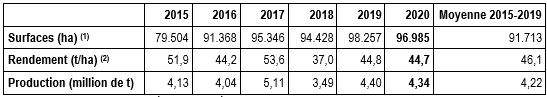 Rekening houdend met de verhoudingen van de arealen en de opbrengsten per hoofdras, wordt de totale opbrengst van de Belgische consumptieaardappelen in 2020 (inclusief vroege aardappelen) geraamd op 4,34 mln ton (zie Tabel 3), 70.000 ton ( -1, 6%) minder dan die van vorig jaar. Dit resultaat lijkt sterk op het gemiddelde van de afgelopen 3 jaar (4,32 mln ton), en is met 220.000 ton (+ 2,9%) gestegen in vergelijking met het gemiddelde van de afgelopen 5 jaar.