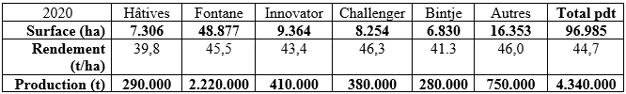 De opbrengst van de vroege aardappelen in 2020 wordt geraamd op 290.000 ton en die van Bintje op slechts 280.000 ton (zie ook Tabel 4). Fontane is verantwoordelijk voor meer dan 50% van de Belgische opbrengst).