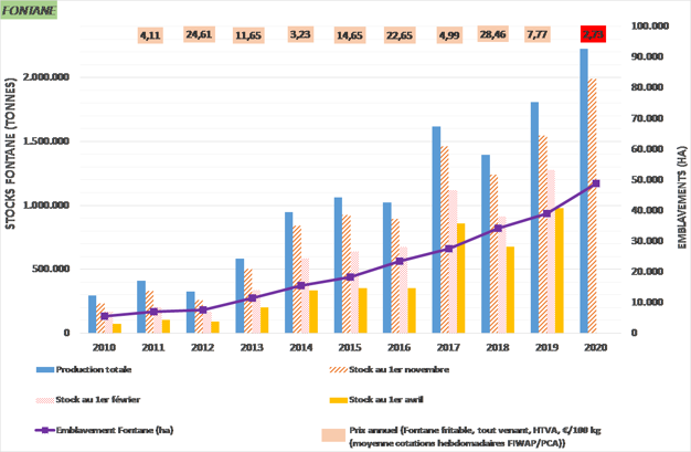 Op 15 november 2020 zijn de Belgische voorraden van alle rassen samen geraamd op 3,25 mln ton, vergelijkbaar met die van vorig jaar en die van het gemiddelde van de afgelopen 3 jaar. Dit cijfer vertegenwoordigt 80% van de initiële bruto opbrengst. Het deel dat op basis van een contract wordt geleverd is groot (2,41 mln ton). Hierdoor blijft er slechts 840.000 ton over dat buiten een contract om wordt geleverd.