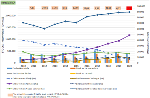 Innovator: volgens de resultaten van het onderzoek bevindt er zich sinds15 november 240.000 ton aan Innovator-aardappelen in Belgische opslagruimten, waarvan 220.000 ton op basis van een contract wordt geleverd en slechts 20.000 buiten een contract om. De voorraad vertegenwoordigt minder dan 60% van de initiële opbrengst, want meer dan 40% is rechtstreeks vanaf het veld afgezet en begin november.