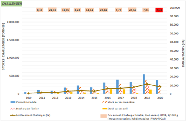 Challenger: de Challenger-voorraden worden geraamd op 250.000 ton, bijna 2/3 van de initiële opbrengst. Het merendeel van de voorraden zijn gecontracteerd (meer dan 70%). De niet-gecontracteerde voorraden worden geraamd op 70.000 ton (ofwel 18% van de initiële opbrengst). De markten zijn tot nu toe 140.000 ton Challenger-aardappelen kwijtgeraakt, waarvan 120.000 ton op basis van een contract wordt geleverd en 20.000 ton buiten een contract om wordt geleverd.