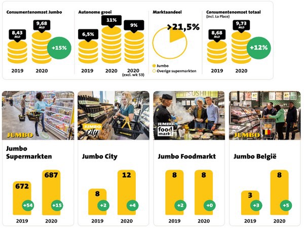Jumbo Groep Holding heeft het uitzonderlijke jaar 2020 afgesloten met een totale omzet van € 9,73 miljard. De consumentenomzet onder de Jumbo formule steeg met maar liefst € 1,25 miljard (+15%) tot € 9,68 miljard. Het boekjaar 2020 bestond uit 53 in plaats van 52 weken. Gecorrigeerd voor deze extra omzetweek zou de groei ten opzichte van 2019 circa 13% bedragen. De omzetbijdrage van foodserviceformule La Place viel terug tot € 50 miljoen (2019: € 165 mln) als gevolg van de noodgedwongen sluitingen door de coronamaatregelen. Ondanks de beperkingen door de pandemie heeft Jumbo haar winkelbestand in 2020 kunnen uitbreiden met 15 vestigingen, voornamelijk op binnenstedelijke locaties in Nederland en op nieuwe locaties in België. Het totaal aantal winkellocaties in beide landen samen is in 2020 uitgekomen op 687. De autonome omzetgroei van de bestaande winkels bedroeg in 2020 11% (gecorrigeerd voor week 53: 9%). Het marktaandeel van Jumbo in Nederland is in 2020 verder gestegen tot boven de 21,5% (bron: Nielsen). Jumbo heeft met al haar medewerkers, ondernemers en leveranciers gedurende het jaar uiterste inspanningen geleverd om de voedselvoorziening op peil te houden en een veilige en prettige winkel- en werkomgeving te waarborgen. Het concern, dat in 2021 honderd jaar bestaat, rekent erop dat de extra maatregelen nog enige tijd zullen voortduren.