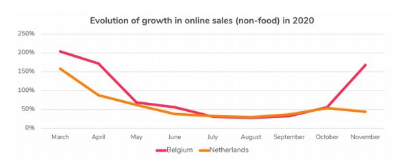 Webshops van retailers deden in 2020 gouden zaken. Zowel food retailers (+186%), als non-food retailers zagen hun online omzet sterk stijgen (+92%). Bovendien winkelden maar liefst 7 op de 10 klanten voor het eerst online.