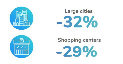 Trend 4: Grootste omzetverlies in grote steden (-32%) en winkelcentra (-29%)