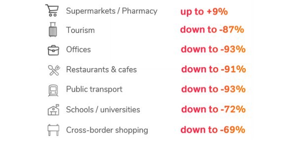 In 2020 was het omzetverlies vooral groot voor winkels die sterk afhankelijk waren van kantoorpersoneel (tot -93%), horeca (tot -91%), toerisme (tot -87%), openbaar vervoer (tot -93%), scholen/universiteiten (tot -72%) en grensoverschrijdende shoppers (-69%).