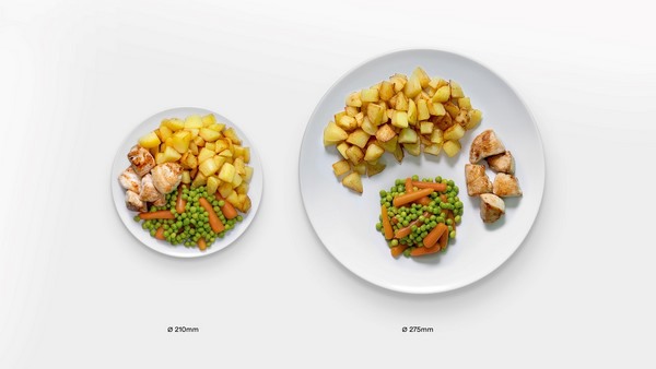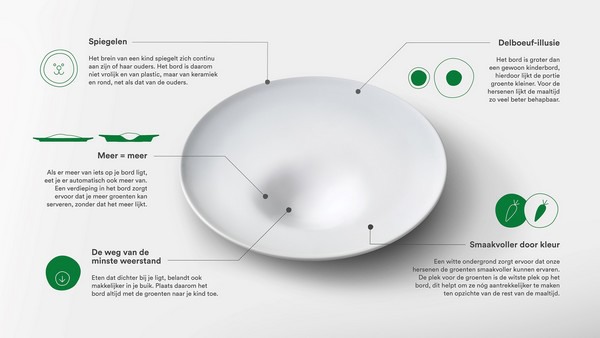 Als er meer van iets op je bord ligt, eet je er automatisch ook meer van. Een verdieping in het bord zorgt ervoor dat je meer groenten kan serveren zonder dat het meer lijkt.
