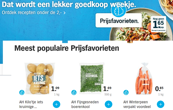 Avondeten voor nog geen 2,- p.p. De marketingcampagne van Albert Heijn trapt het nieuwe jaar af met budgetkoken. In de campagne staan de 12 meest gegeten gerechten van Nederland centraal, zoals Bami, Boerenkool met worst of Spaghetti bolognese die allemaal te maken zijn met de altijd laaggeprijsde Prijsfavorieten.