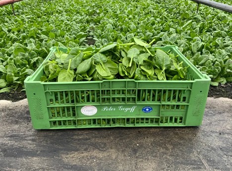 De eerste Duitse spinazie van dit seizoen is al op de markt. "In onze kas heeft de spinazie de gehele winter zonder verwarming doorgebracht. Daarmee ontziet hij het klimaat, maar is hij ook robuust gegroeid. Bij vorst hebben we onze spinazie ter bescherming stevig afgedekt. Zo konden we dan deze week de eerste partijen oogsten en op de weekmarkt aanbieden", zegt Peter Gogeff, teler en eigenaar van het gelijknamige groententeeltbedrijf.