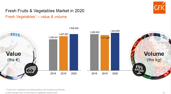Groenten en fruit lijken top of mind in Nederland. Met een groei van 11 procent is vers de groeiaanjager in de totale omzet van FMCG (+9%). De groei van groenten (12,5%) ligt al hoger dan gemiddeld vers, fruit draagt met +18,1 procent het meeste bij. “Gezondheid in combinatie met een verandering in leefstijl zorgt voor deze groei”, zei Eric Harmsen van GfK. Vooral jongeren hebben hun leefstijl aangepast. Door een beperking van sociale contacten en het buiten de deur eten, komen ze uit hun comfortzone. Ze zijn hun voorraadkast gaan vullen en meer zelf gaan koken. Jonge huishoudens zonder kinderen kochten 38 procent meer AGF in het vierde kwartaal van 2020 ten opzichte van 2019.