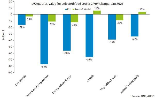 Voor de landbouwsector werd de handel in januari sterk door deze factoren beïnvloed. De totale uitvoer van levensmiddelen en levende dieren daalde met 46% in waarde (-545 miljoen pond) in vergelijking met januari 2020, hoewel de uitvoer van levensmiddelen en levende dieren alleen al in de EU met ongeveer 59% daalde, van 793 miljoen pond tot 323 miljoen pond. Binnen de landbouwindustrie is de vleessector een van de zwaarst getroffen sectoren, met een daling van de uitvoer naar de EU met 59%, van 130 miljoen pond naar 53 miljoen pond. De uitvoer naar de rest van de wereld van levensmiddelen en levende dieren is met ongeveer 19% gedaald, wat erop wijst dat ook andere factoren dan de nieuwe handelsvoorschriften met de EU van invloed zijn op de handel.