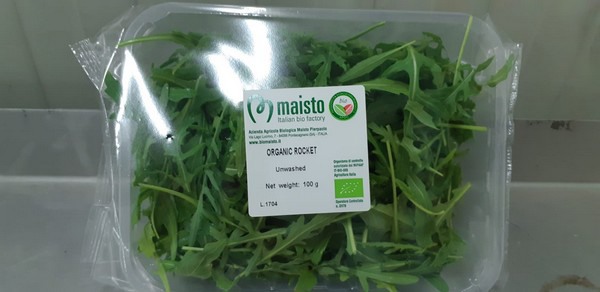 Biologische rucola in een verpakking van een lid van APOC (Foto verstrekt door Rita Miano)