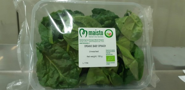 Biologische baby spinazie in een verpakking van een lid van APOC (Foto verstrekt door Rita Miano)