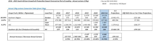 De Zuid-Afrikaanse grapefruitoogst is slechts marginaal gestegen in vergelijking met de andere citrusvariëteiten zoals citroenen en late mandarijnen, met name in de noordelijke regio van Zuid-Afrika waar ongeveer 88% van alle grapefruit wordt geteeld. De latere exportregio's leveren hoeveelheden die voor de Westkaap worden geraamd op ongeveer 9,2% en voor de Oostkaap slechts op 2,6% van de totale grapefruitoogst van Zuid-Afrika voor seizoen 2021.