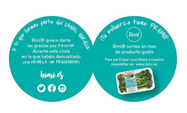 "Alle Bimi-trays hebben een nieuw en heel bijzonder label dat alle horeca-etablissementen bedankt voor hun volharding en inspanningen om het hoofd boven water te houden terwijl er voor sommige ondernemingen maandenlang geen eurocent in het laatje kwam”, zegt Alberto Alapont, distributiemanager bij Bimi.