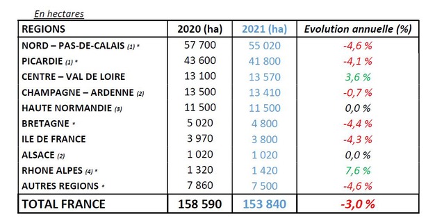 Volgens het UNPT-CNIPT-telerspanel bedroeg in de belangrijkste teeltregio's, aangevuld met Agreste-ramingen voor de andere regio's, het aantal ha aangeplante consumptieaardappelen in 2021 153.840 tegen 158.590 ha in 2020, een daling van 3,0% in oppervlakte, ofwel 4.750 ha minder. Voor de volledigheid: er was sprake van een toename van het oppervlak van 1,4% in 2020 in vergelijking met dat in 2019.