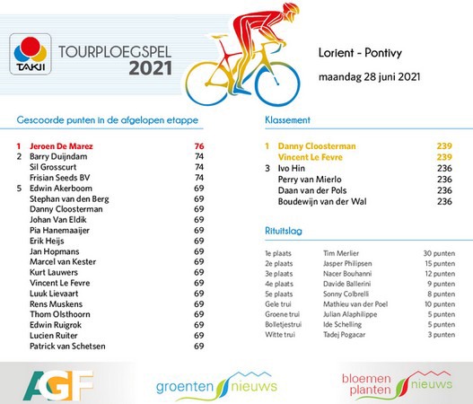 In het algemeen klassement bleef Mathieu van der Poel in Frankrijk aan kop staan. Het Takii Tourploegspel kreeg wel nieuwe leiders. Danny Cloosterman en Vincent Le Fevre zijn de nieuwe trotse koplopers. Maar, Parijs is nog ver...