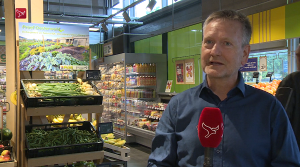 Jan-Albert Blauw wordt geïnterviewd door Omroep Flevoland voor het schap met groenten uit stadslandbouwproject Oosterwold (foto: still uit filmopname)