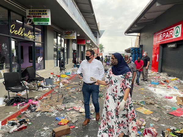 John Steenhuisen van de Democratische Alliantie, de officiële oppositie van het land, bezoekt vandaag de verwoestingen in Durban, KwaZulu-Natal. Hij spoorde andere politieke leiders en de leiding van de politie aan om hetzelfde te doen (bron: Twitter Roman Cabanac)