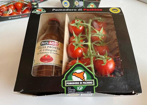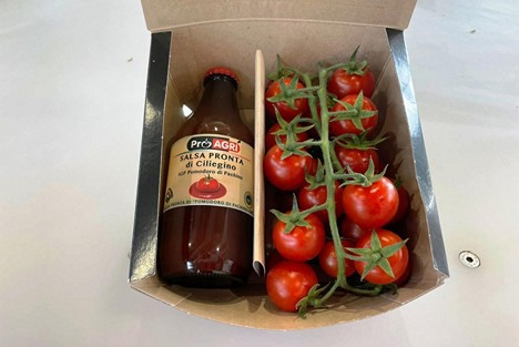 De nieuwe ProAgri-verpakkingen, die een tros Pachino cherrytomaten van 500 gram en een fles kant-en-klare saus van 330 gram bevatten, zitten in een kartonnen doos van 40x60 cm, die kan worden gestapeld tot 88 verpakkingen per pallet.
