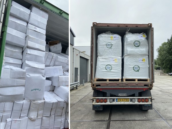 Links traditioneel verpakte cashewnoten en rechts de in big bags verpakte cashewnoten gereed voor transport.