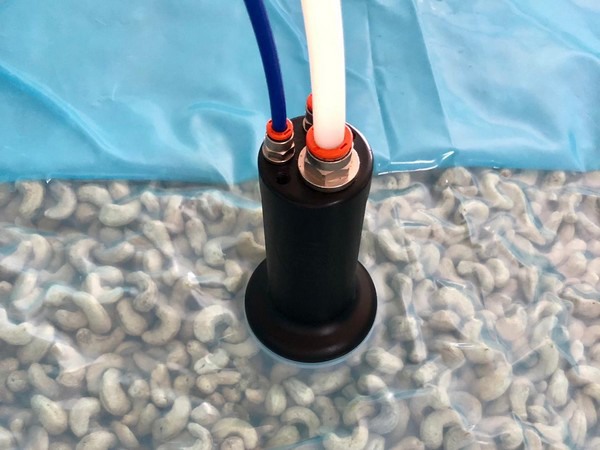 Klep en kop met gepatenteerde membraanfunctie op een gevacumeerde big bag met cashewnoten.
