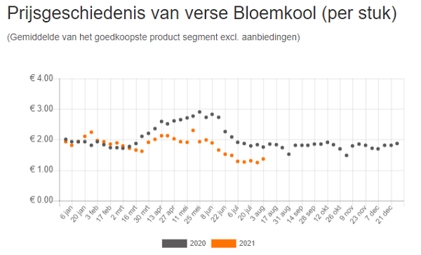 De gemiddelde prijs van bloemkool dook na 9 maart 2021 onder het niveau van 2020. Het grootste prijsverschil was op 25 mei, toen kostte een bloemkool gemiddeld 2,90 euro in 2020 en dit jaar was dat 1,94 euro. Deze week liggen de gemiddelde prijzen dichter bij elkaar, ondanks dat 5 supermarkten de bloemkool deze week in de aanbieding hebben: Dirk (0,99 euro); Plus (1,19 euro), Jumbo (1,29 euro), DekaMarkt (1,39 euro) en Coop (1,50 euro). Vomar valt ook op, ze hebben geen reclame, maar een bloemkool kost 1,49 euro. De gemiddelde prijs komt uit op 1,36 euro, vorig jaar lag deze op 1,76 euro.